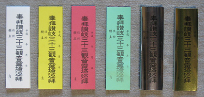 各霊場を巡拝した時に巡拝した「しるし」となるもので、日時と願主を記入し各寺院の納め札入れに入れます。 なお、霊場会で巡拝回数により納札の色を指定しています。 1~2回の方は白色で100円。草色(150円)は3回以上、黄色(150円)は5回以上、赤色(150円)は10回以上、銀色(600円)は15回以上、金色(600円)は20回以上となっています。